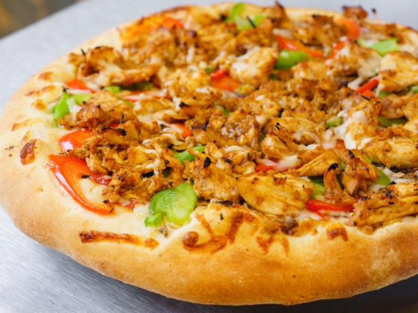 BBQ sauce, mushrooms, onions, green and red bell peppers and marinated BBQ chicken.