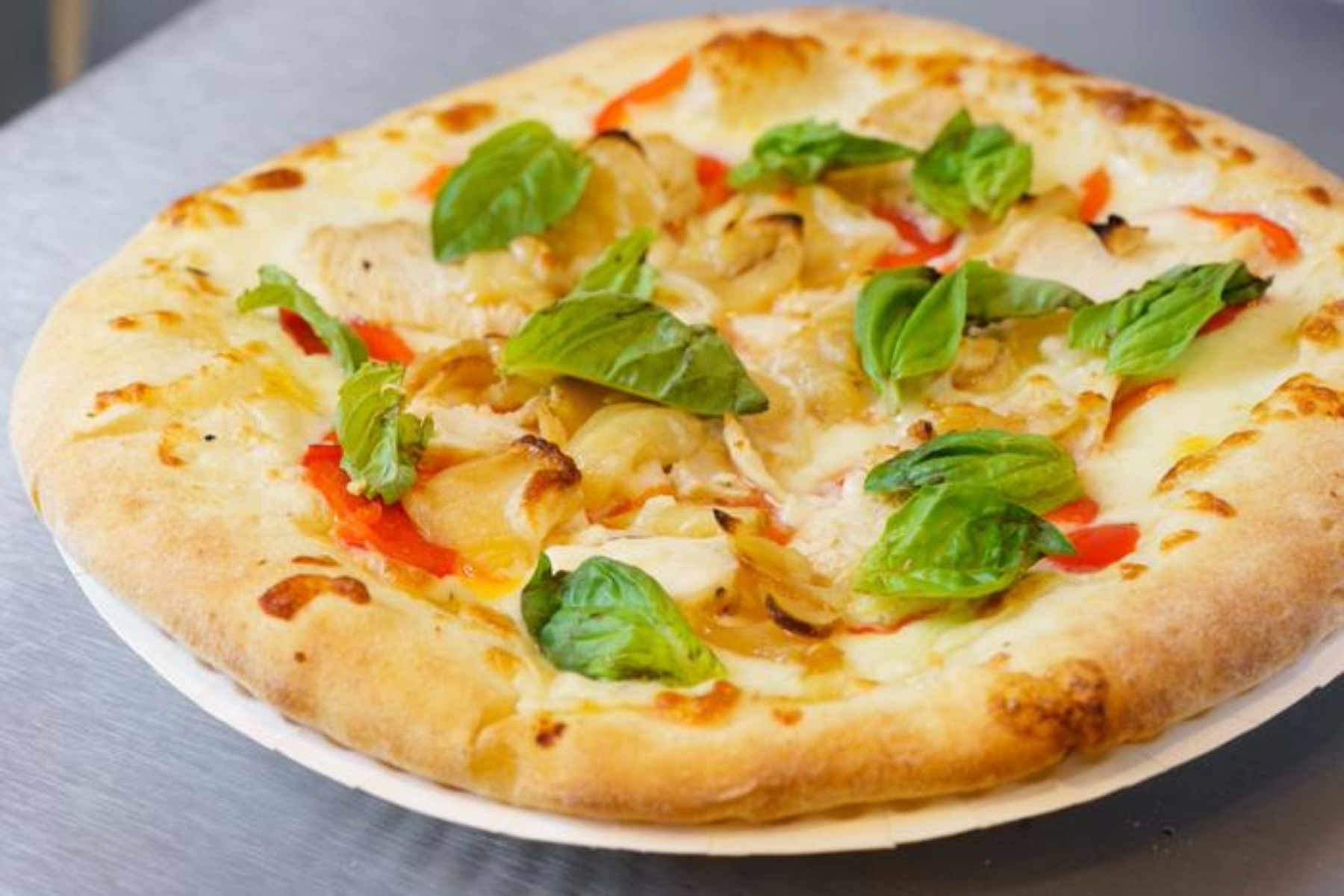 Garlic sauce, grilled chicken, red bell pepper, fresh basil and roasted garlic.
