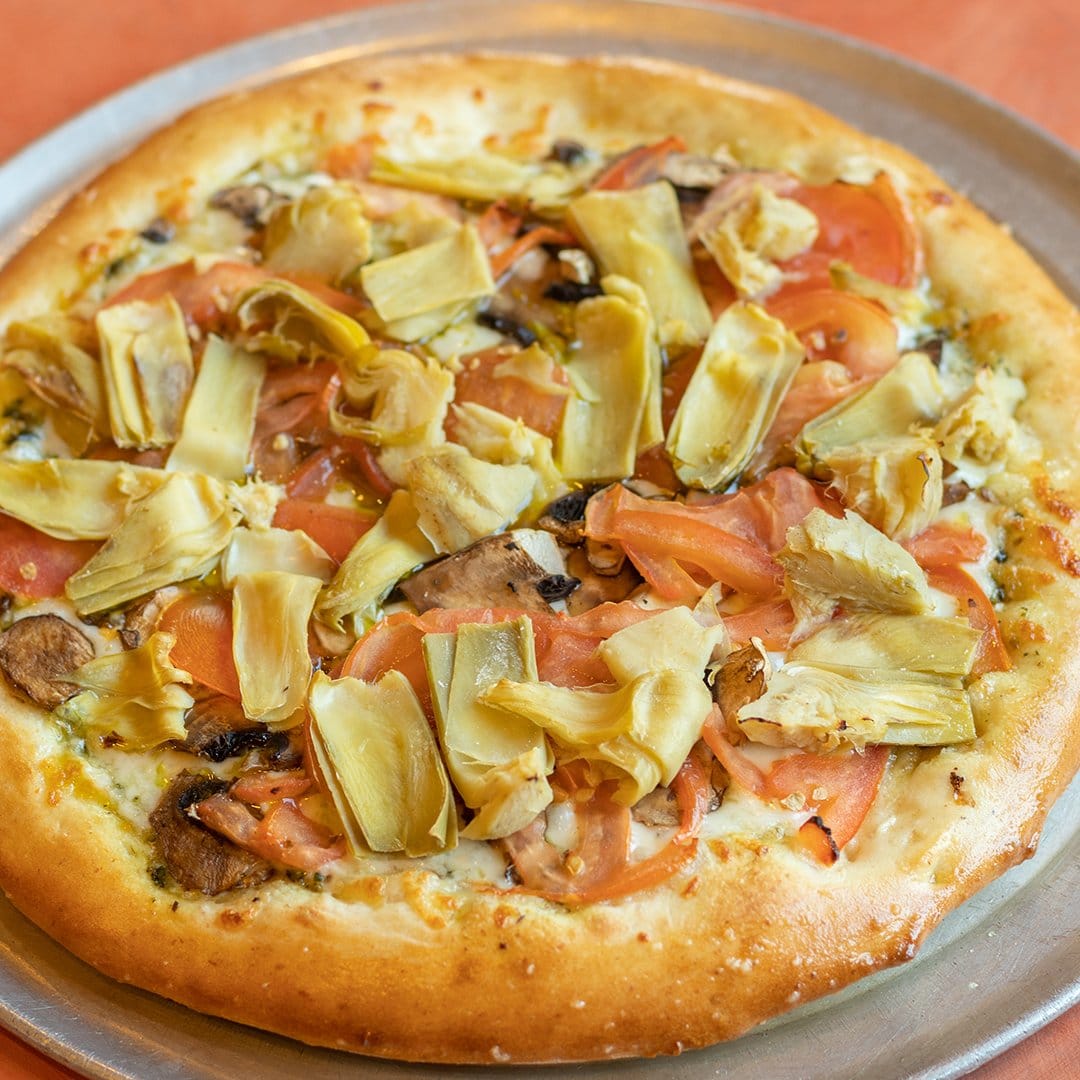 Pesto sauce, tomato, mushroom, and artichoke hearts.