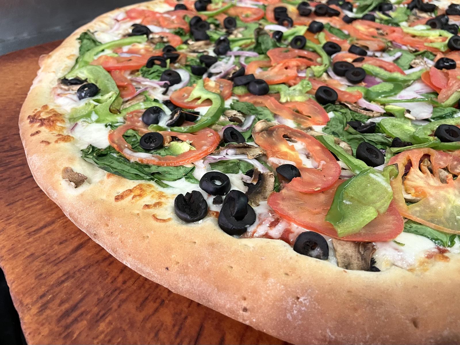 Tomato sauce with mushrooms, onions, green bell peppers, tomatoes, olives, and spinach
